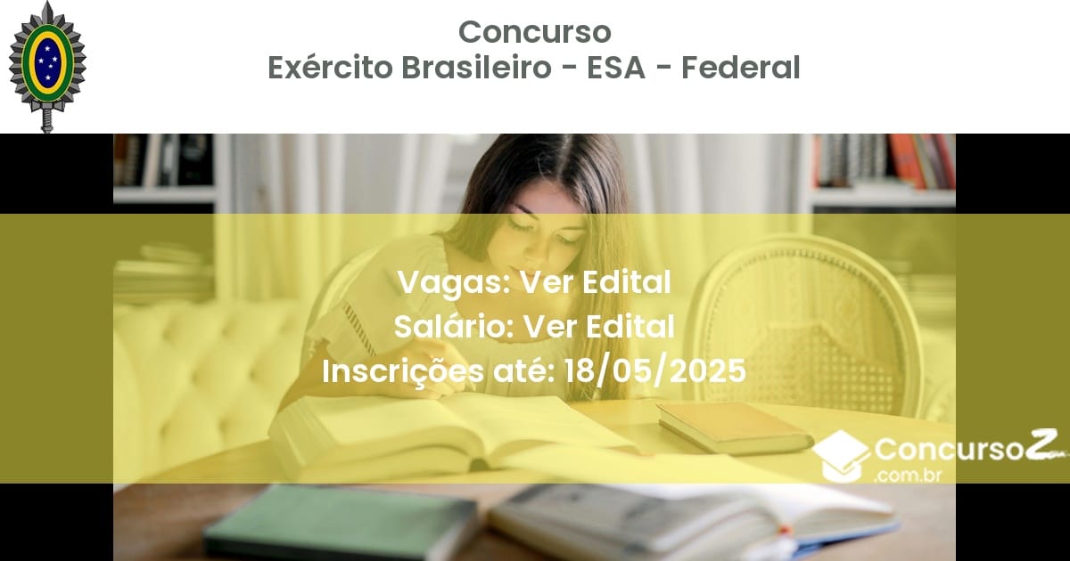 Exército Brasileiro – Federal Vagas: Ver Edital Cargos: Vários Cargos Escolaridade: Superior Inscrições até: 20/06/2025